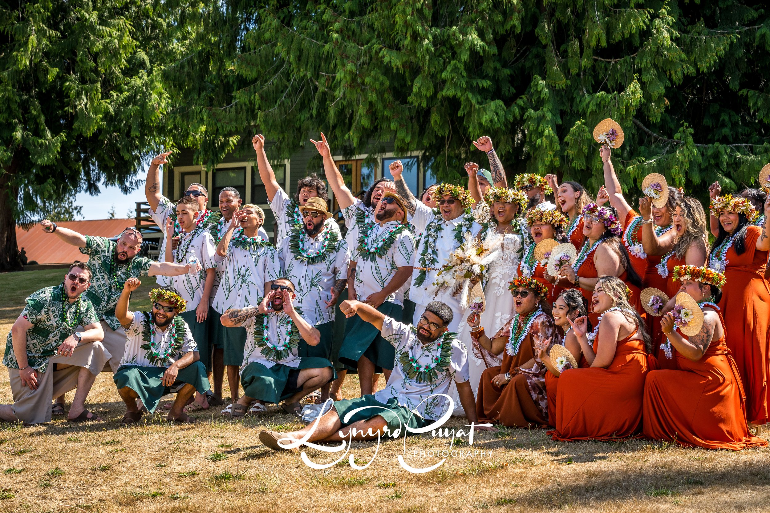 A group of people dressed in colorful Hawaiian-themed clothing, posing outdoors under green trees, celebrating a wedding with joyful expressions, some wearing floral leis, flower crowns, and holding fans or bouquets.